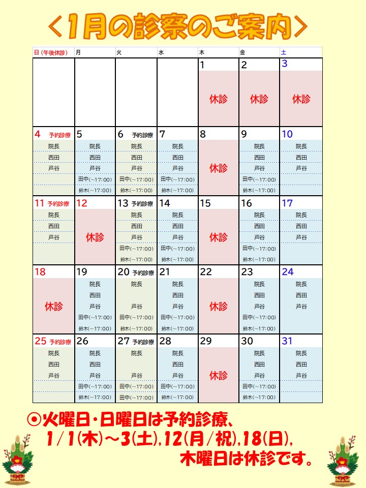 2026年1月の診療時間、休診日、予約診療は上記の通りになります。