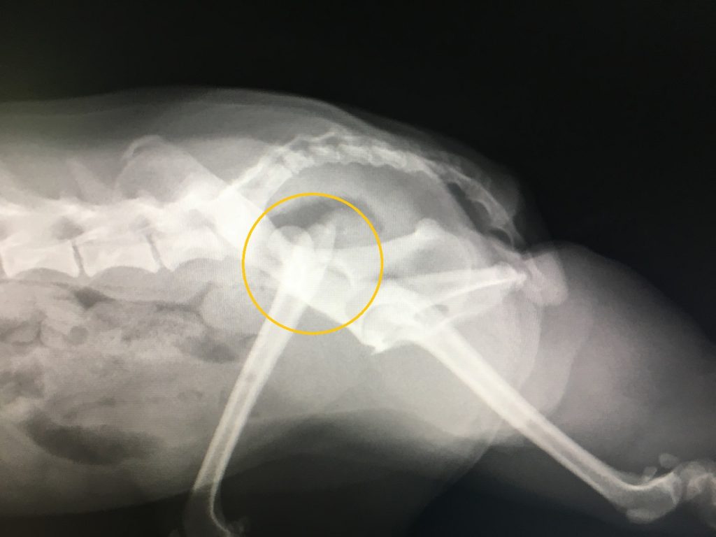 来院時の触診では股関節部に激しい痛みが認められ、レントゲン検査を行ったところ、左後肢の股関節脱臼が確認されました。