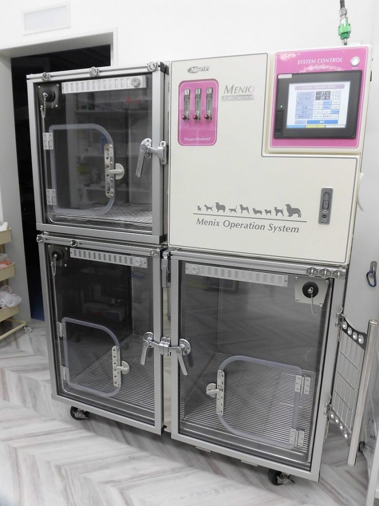 このICUによって、酸素濃度、温度、湿度を完全にコントロールでき、循環器疾患や呼吸器疾患などの重篤な疾患の動物達の救命率を上げることが期待できます。