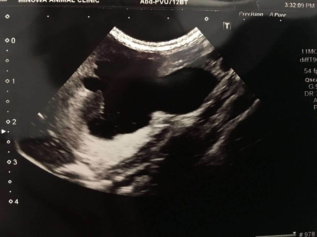 次いで超音波検査およびレントゲン検査を実施したところ、結石により尿管が閉塞し、腎盂の拡張および尿管の拡張が認められました。