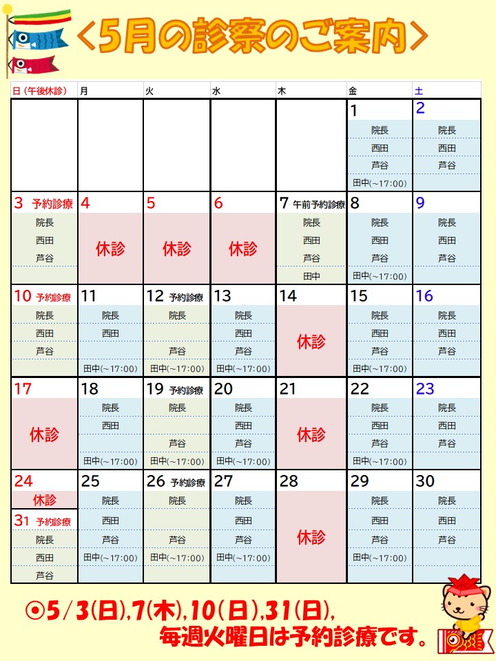 5月の診療時間、休診日、予約診療は上記の通りになります。