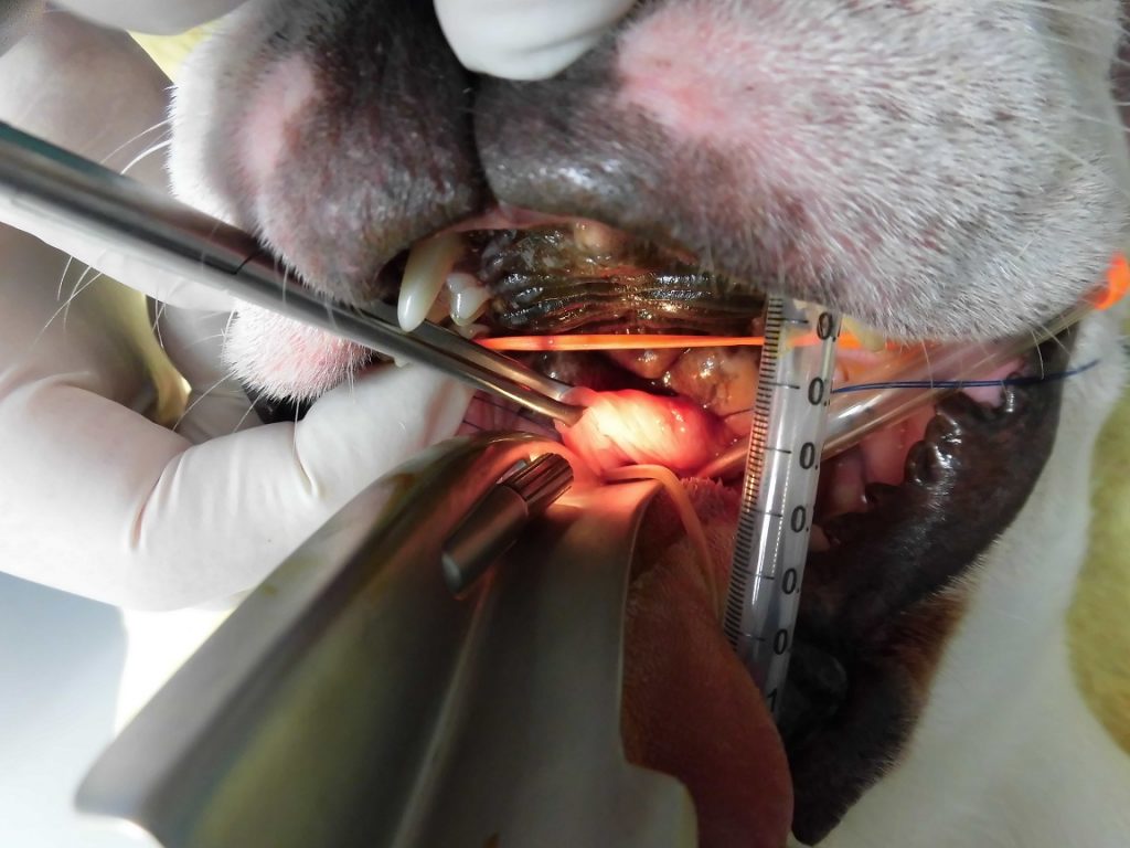分かりにくいですが、中央のつまんでいる部分が垂れ下がっている軟口蓋です。これがあるために気道が狭くなり呼吸しにくくなってしまいます。